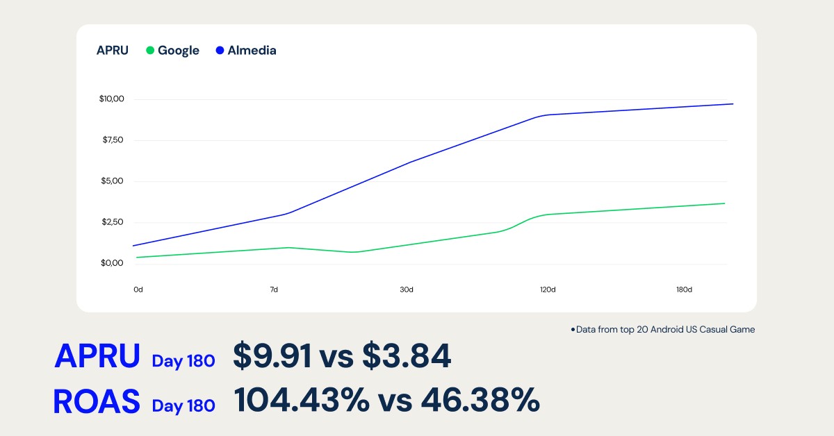 In 2026, we expect rewarded to continue its takeover of ad budgets and market share, and with its ability to double ROAS and increase retention and LTV compared to alternative channels, it’s easy to see why. We compared rewarded users from Almedia to Google users for a top mobile game, and the results were stark. The rewarded users outperformed traditional in their D180 ROAS (104.43% vs 46.38%) and D180 ARPU ($9.91 vs $3.84), an enormous difference in quality when scaling.
